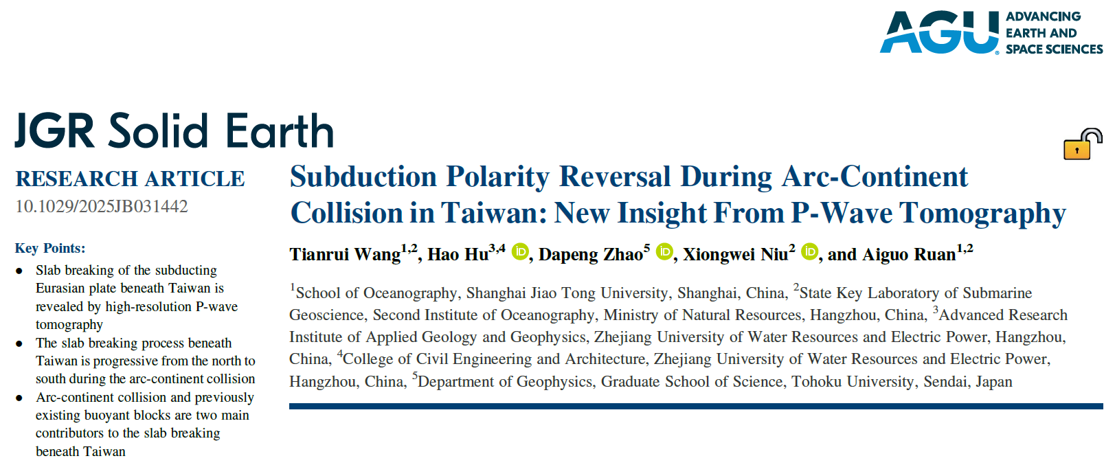 近日,我院胡昊副教授联合指导的上海交通大学海洋学院博士生王天睿在国际权威地学期刊《Journal of Geophysical Research: Solid Earth》以第一作者身份发表题为《Subduction polarity reversal during arc-continent collision in Taiwan: New insight from P-wave tomography》的研究论文。胡昊副教授和上海交通大学海洋学院阮爱国研究员为本文的通讯作者,合作者还包括国际著名地震学家赵大鹏教授(日本东北大学)和牛雄伟研究员(海底科学与划界全国重点实验室)。